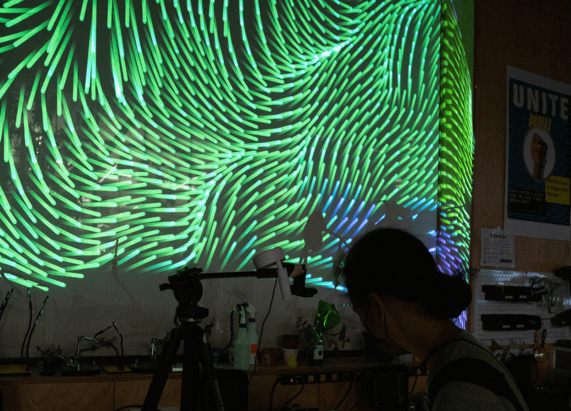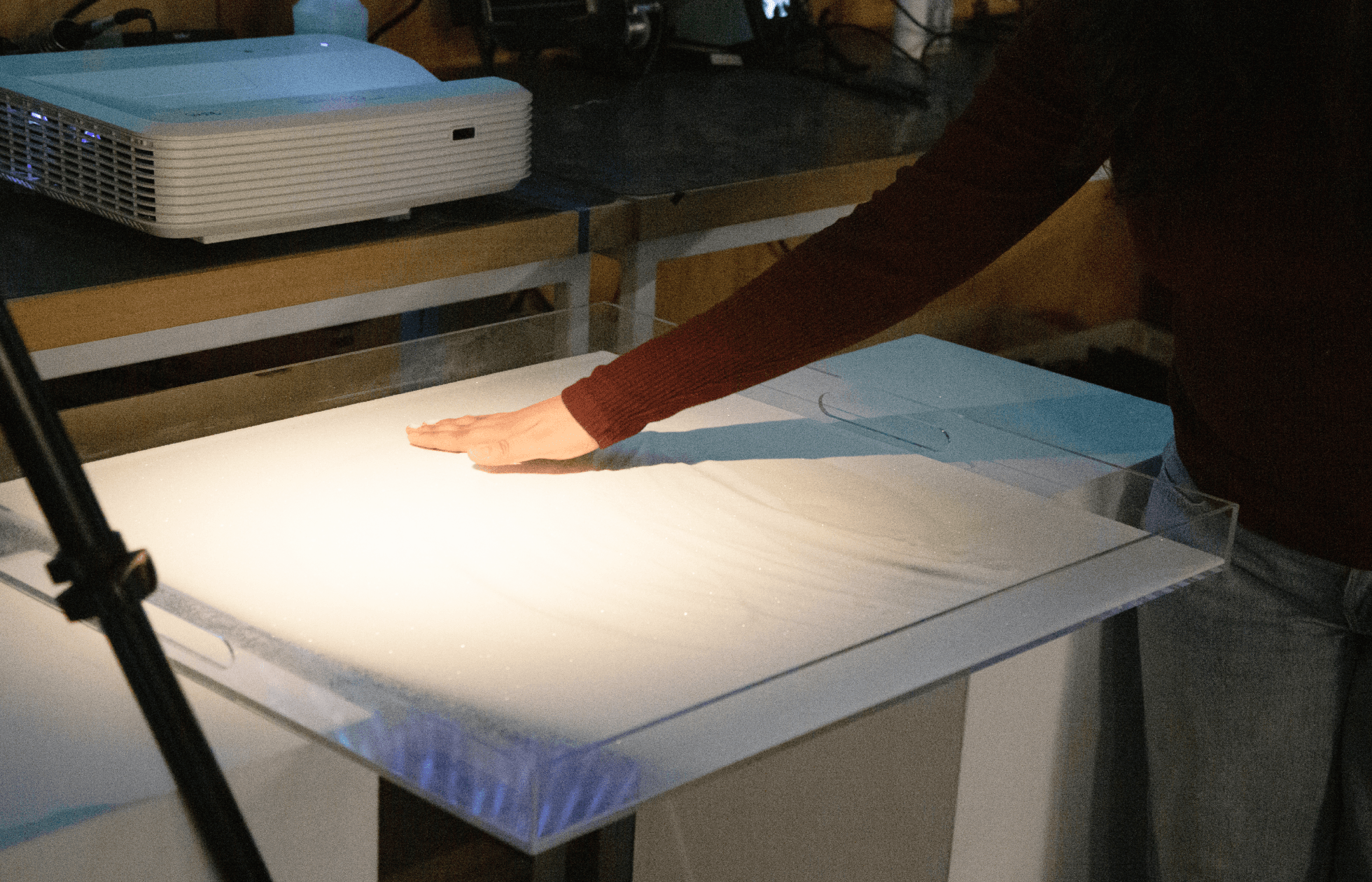 Inspired by the computational work of Zach Lieberman, this installation uses real-time graphics and sensing to generate responsive visual output. As users manipulate sand, the digital landscape updates accordingly. The project integrates physical interaction with computational visuals to create a unified immersive experience..